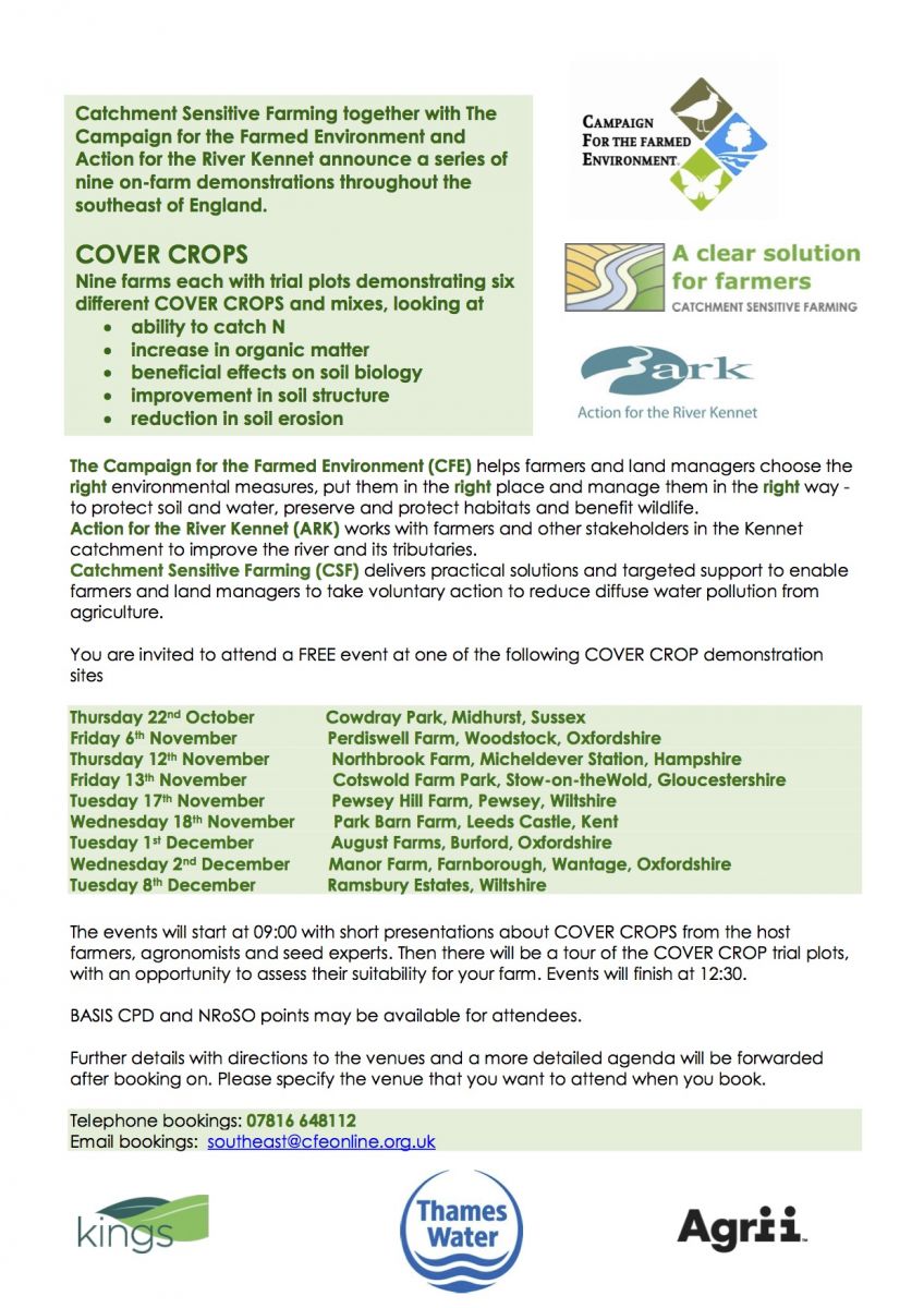 The Campaign for the Farmed Environment, ARK and Catchment Sensitive Farming and organising a series of free events at selected Cover Crop demonstrations sites.