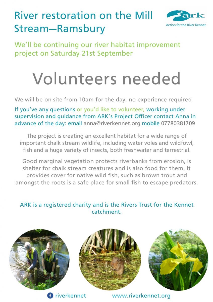 10am - 4pm Completing our restoration of a stretch of the Mill Stream, including planting up. Contact anna@riverkennet.org to book your place. Meet at 10am by the entrance to the Reserve (by the Fire Statiin), High Street, Ramsbury.