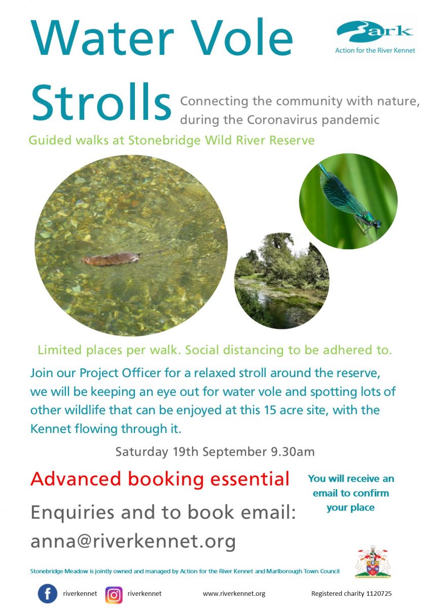 Advanced booking essential. Suitable for families. Join us for a socially distanced Vole Stroll. A chance to join our Project Officer for a led walk at Stonebridge Wild River Reserve. 9.30am start, email anna@riverkennet.org to book your place. Bookings will be confirmed via email and full details provided.