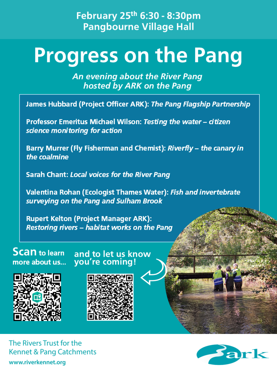 Join us in Pangbourne to catch up with all we've been doing on the River Pang. Our Pang Project Officer James along with a range of speakers will be discussing WQ testing, the Sulham wetland creation, water vole surveying, riverfly monitoring and much, much more!