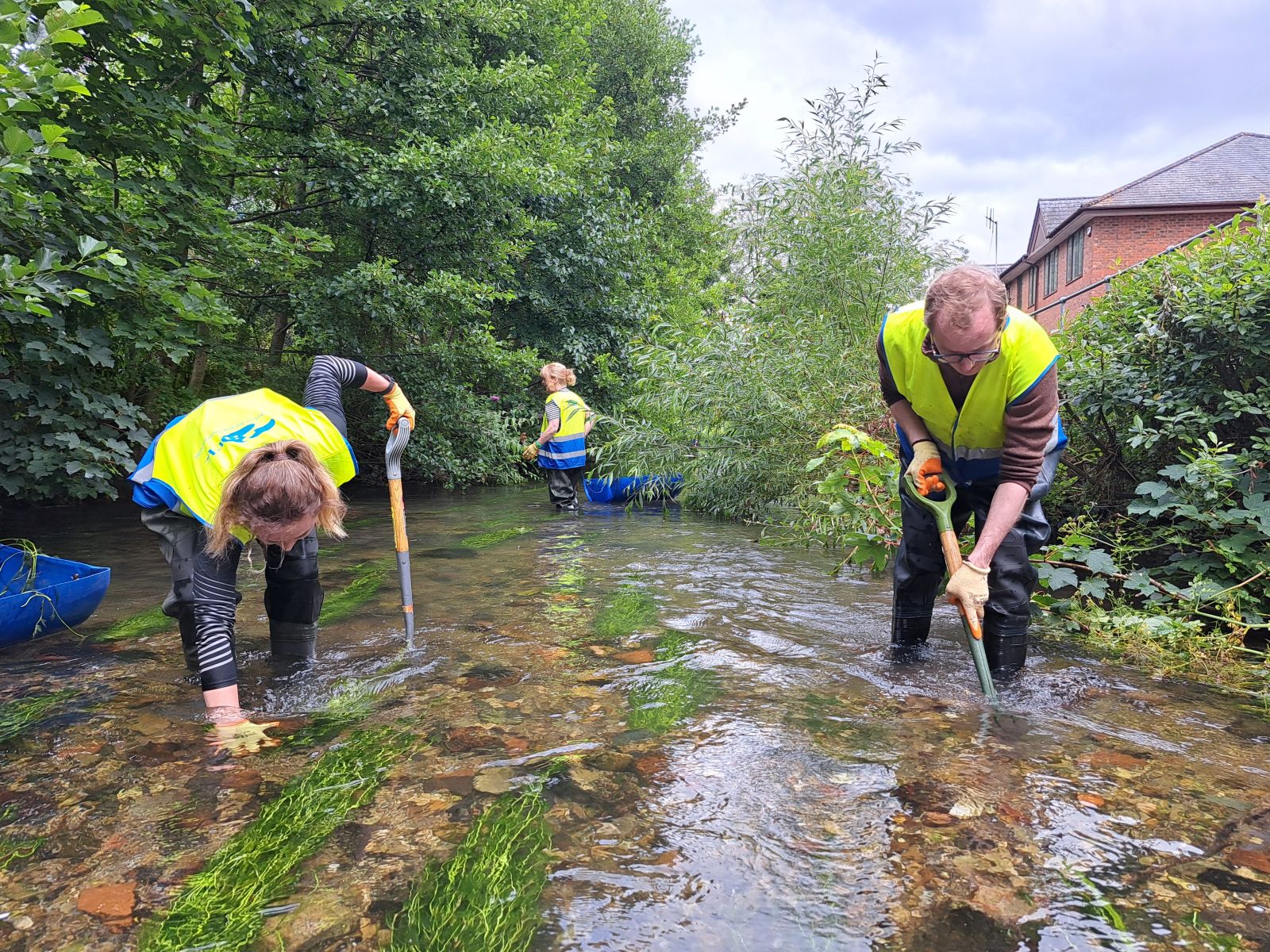 Volunteer and help plant stream water-crowfoot crowns in a new by-pass channel created last autumn to ease fish passage on the Kennet.