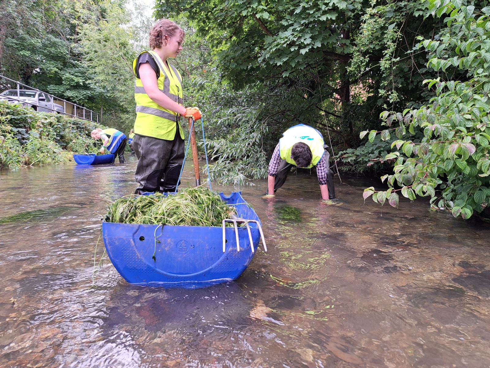 We'll be harvesting the aquatic chalk stream plant stream-water crowfoot from a stretch where it it well established in the morning and planting it in the afternoon.