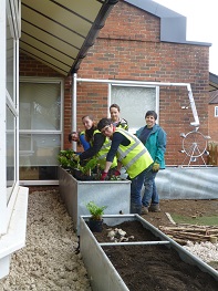 The planters and the rain garden are packed with plants that can cope with downpours and are tolerant of dry periods. Should they need watering, we had already installed a water butt during a previous project at the school.