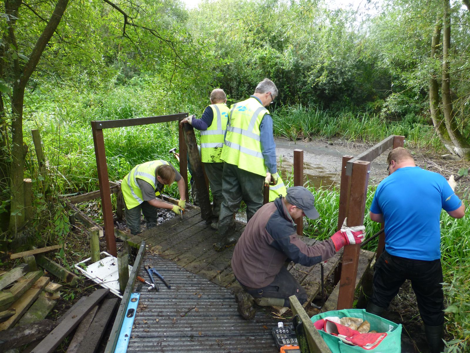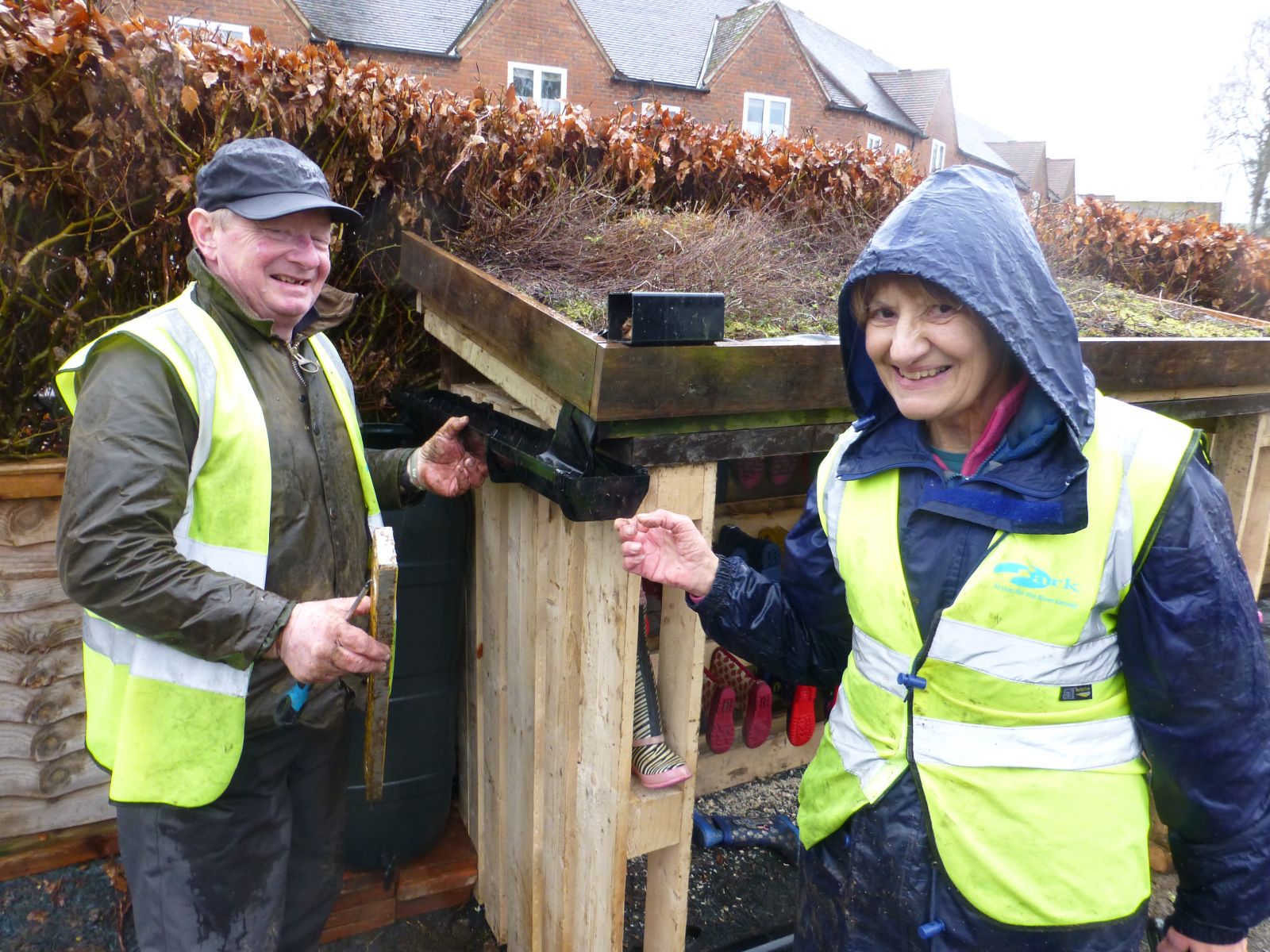 Green roof welly store for local primary school Pond dipping platform installed by volunteers at Ramsbury Reserve